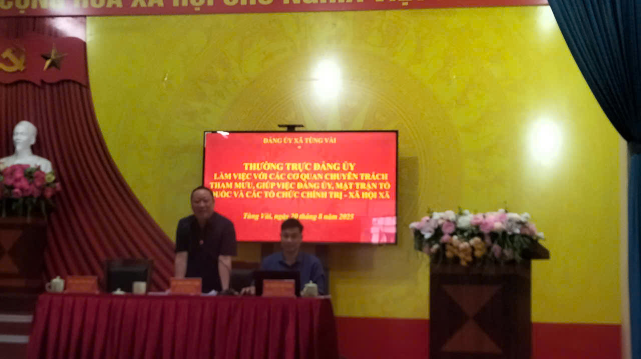 Sáng ngày 20/8/2025, Thường trực Đảng ủy xã Tùng Vài đã có buổi làm việc với các cơ quan chuyên trách tham mưu, giúp việc Đảng ủy; Ủy ban Mặt trận Tổ quốc và các tổ chức chính trị - xã hội của xã.