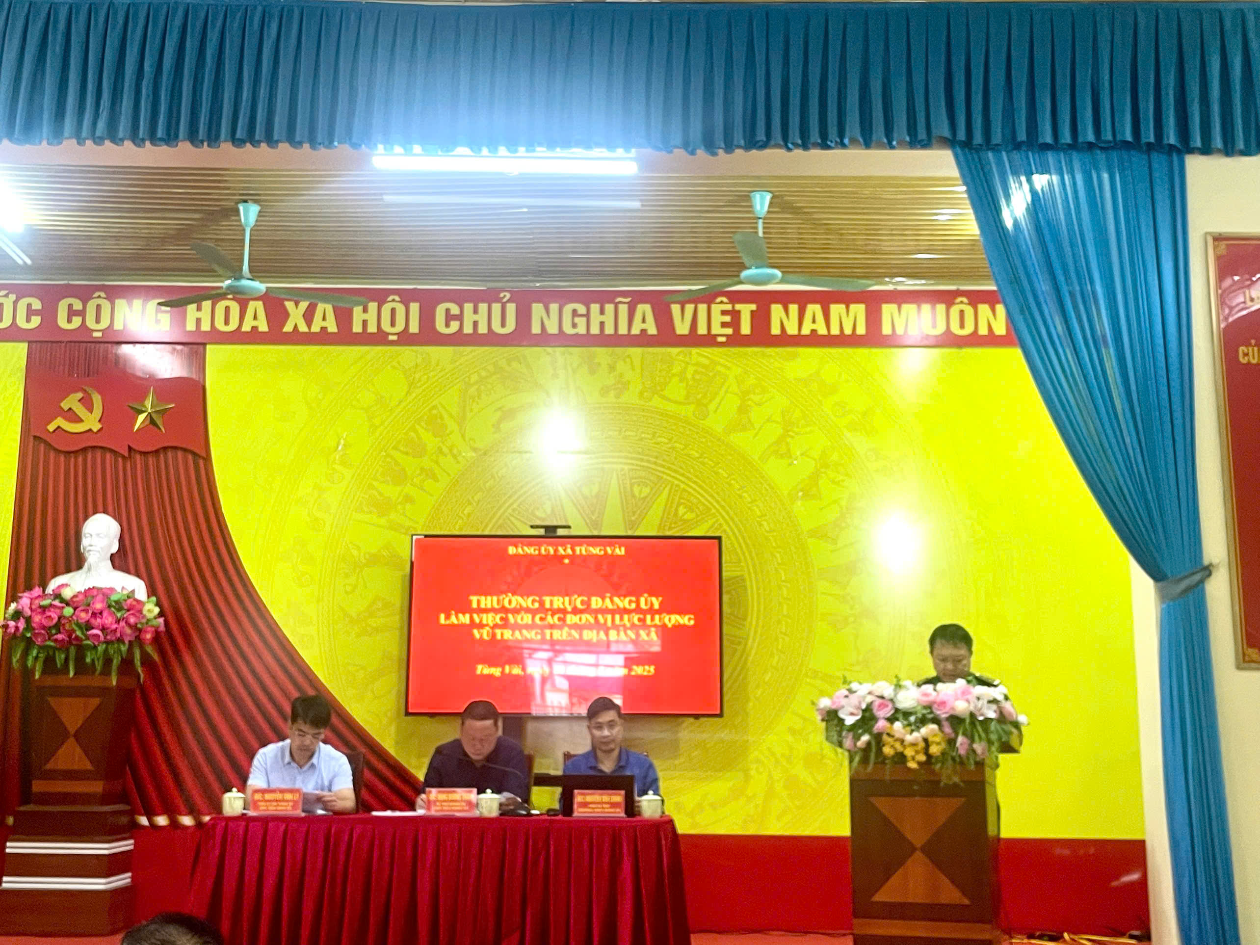 Chiều ngày 20/8/2025, Thường trực Đảng ủy xã Tùng Vài đã có buổi làm việc với ba lực lượng: Công an, Đồn Biên phòng Tùng Vài và Ban Chỉ huy Quân sự xã.