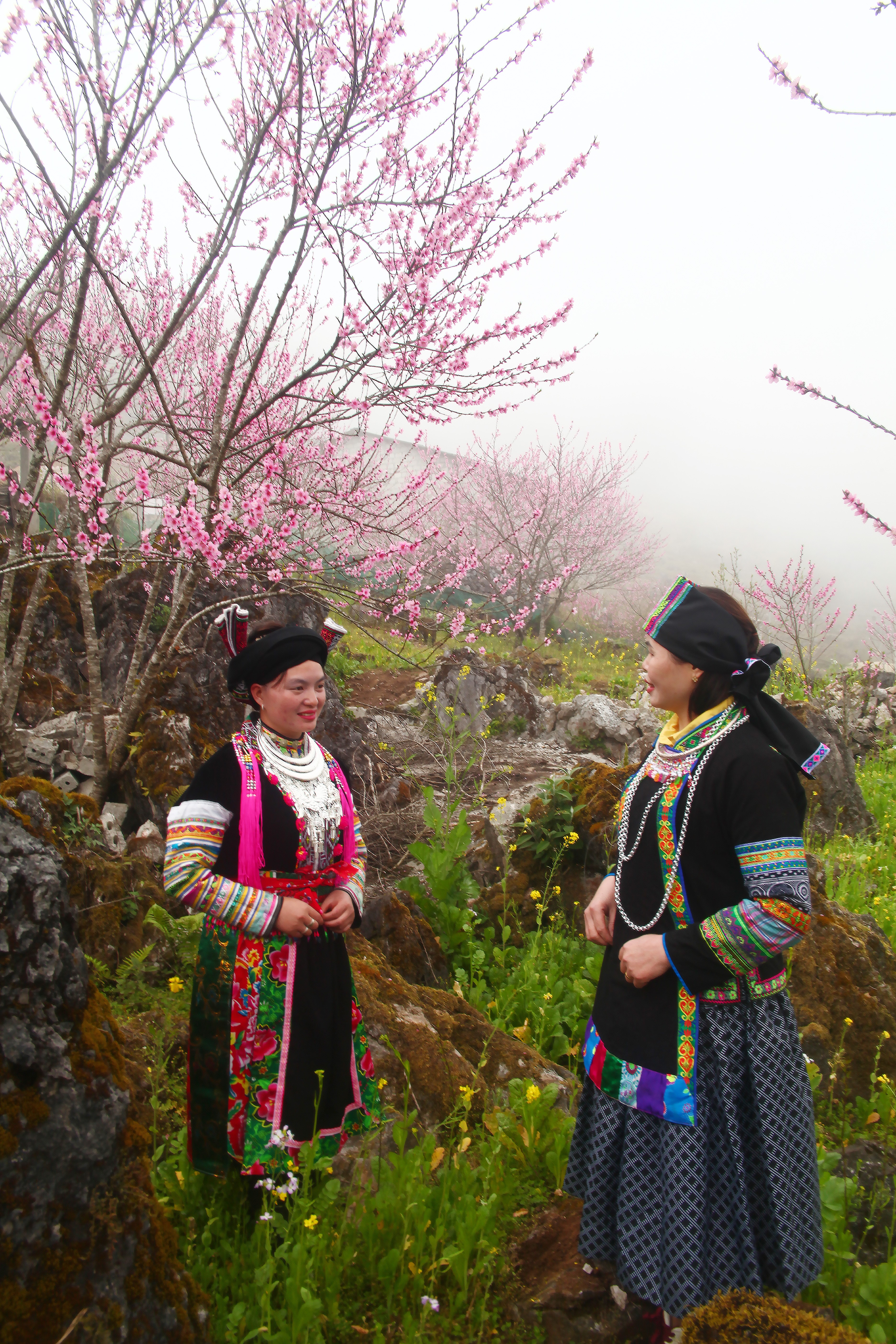 Người phụ nữ dân tộc Dao, Bố y tại địa phương trong váy áo sặc sỡ đứng bên hoa đào tạo nên bức tranh xuân rực rỡ giữa đại ngàn biên ải.